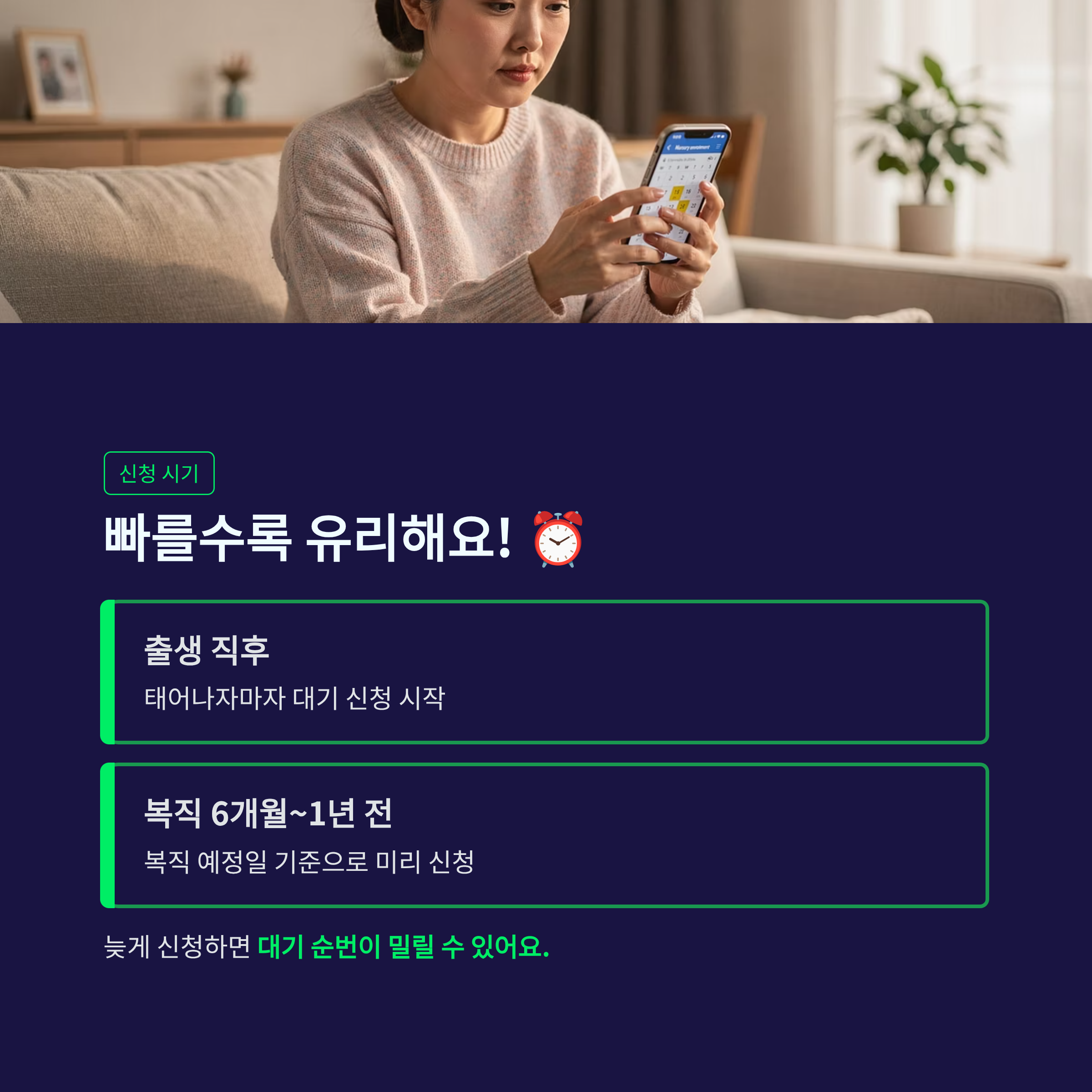 국공립은 대기 순번이 중요하기 때문에 늦게 신청하면 순번이 밀릴 수 있어요.