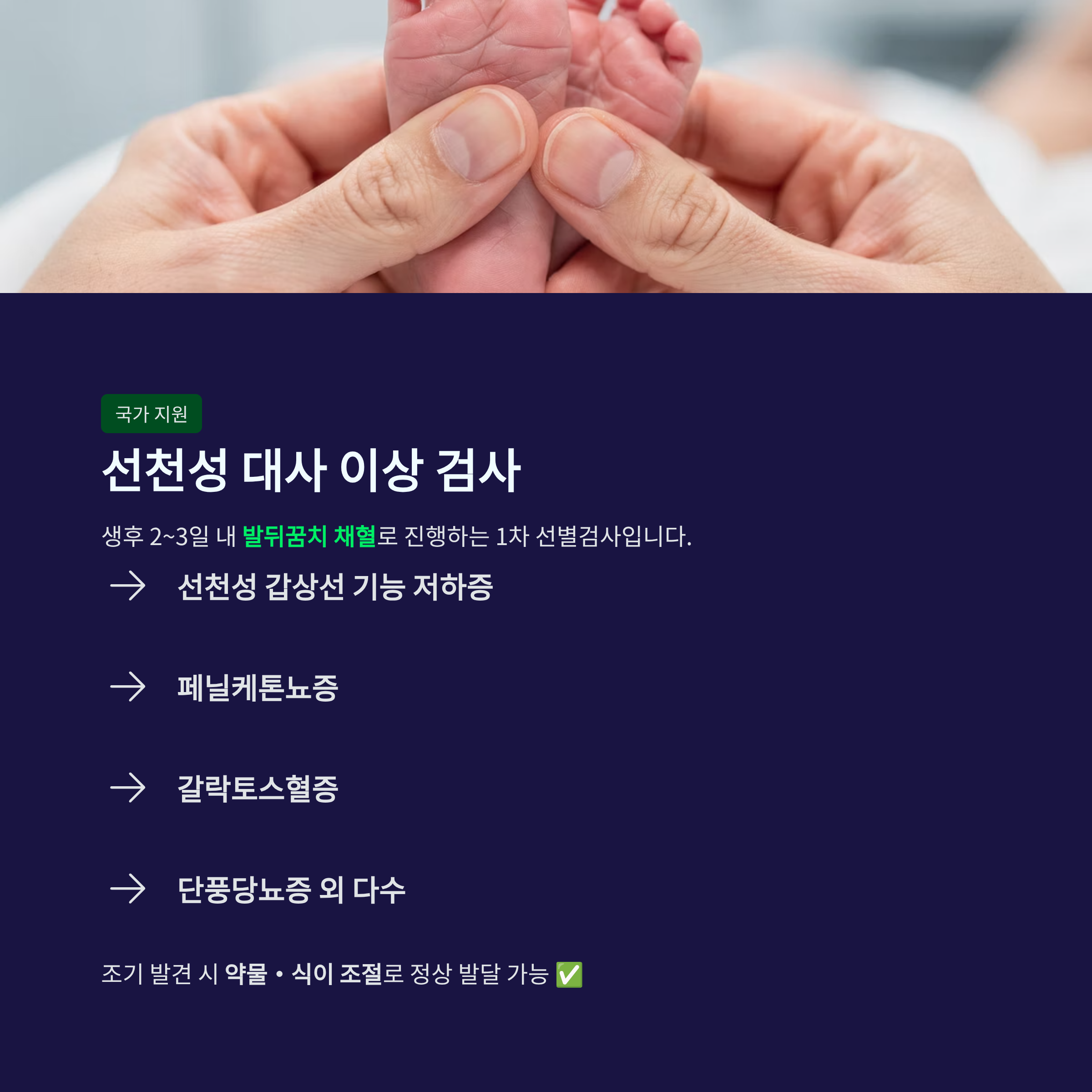 이 질환들은 조기 발견 시 약물 또는 식이 조절로 정상적인 성장과 발달이 가능합니다.