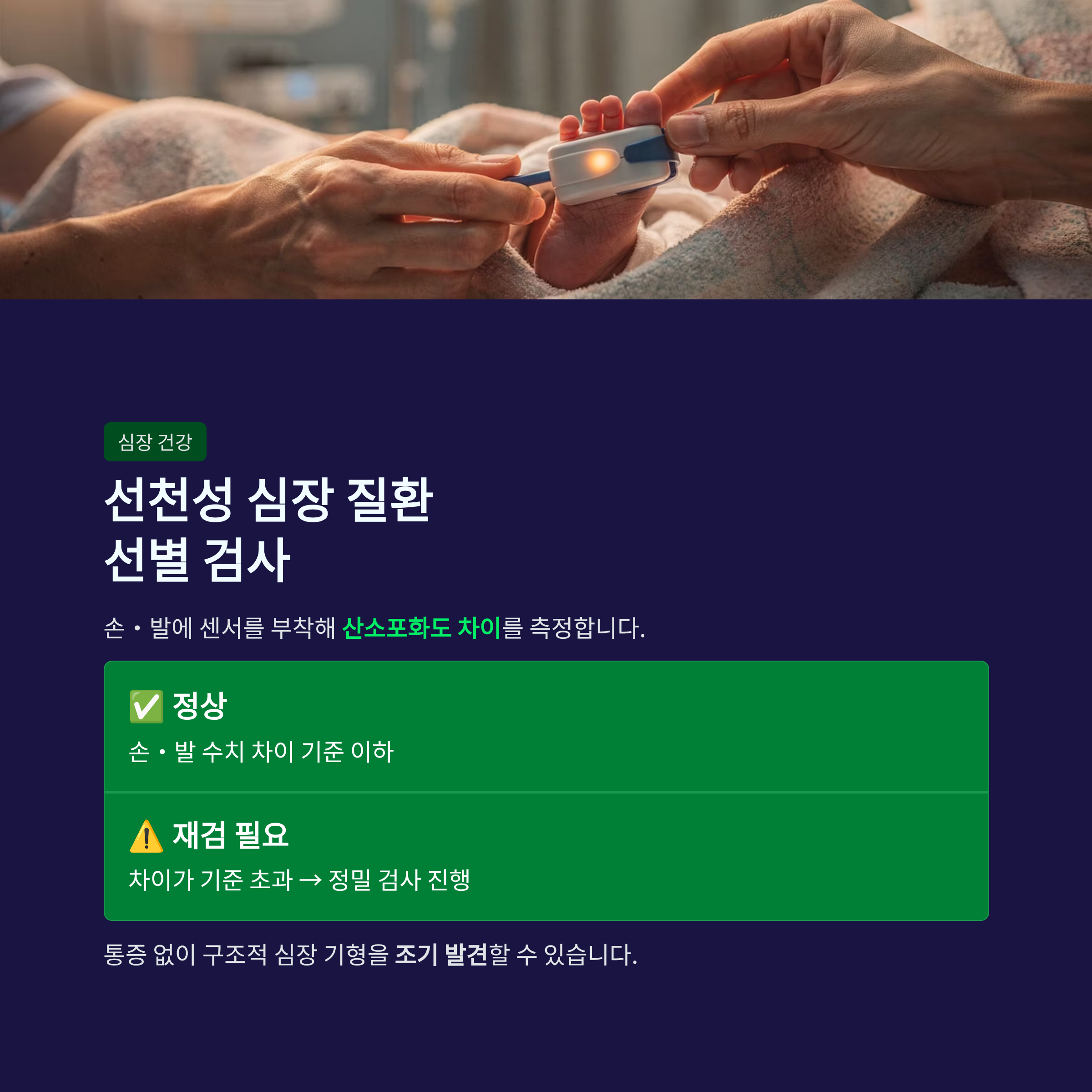 최근에는 산소포화도 측정을 통해 선천성 심장 질환을 조기에 선별합니다.
