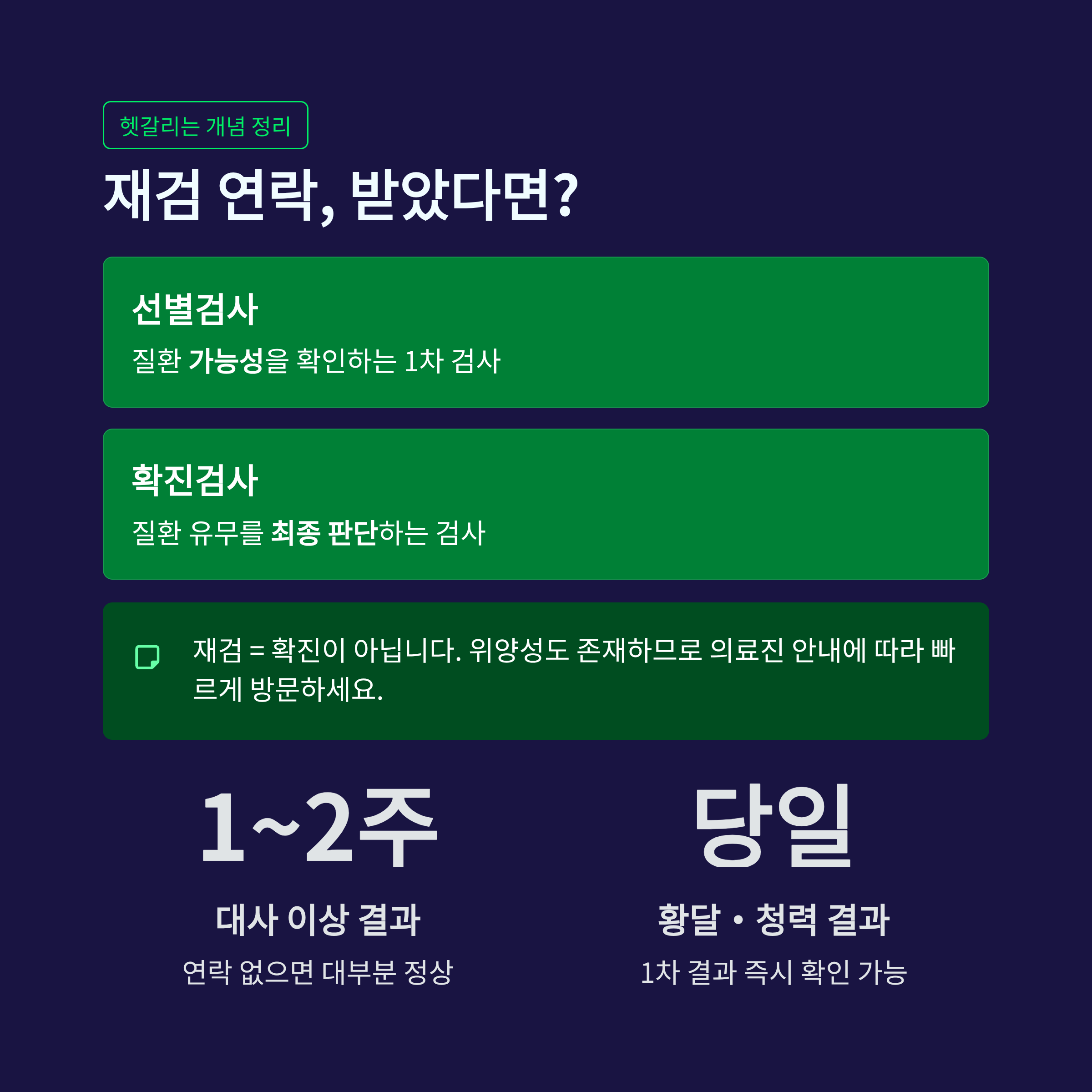 따라서 재검 연락을 받았다고 해서 반드시 질환이 있다는 의미는 아닙니다.