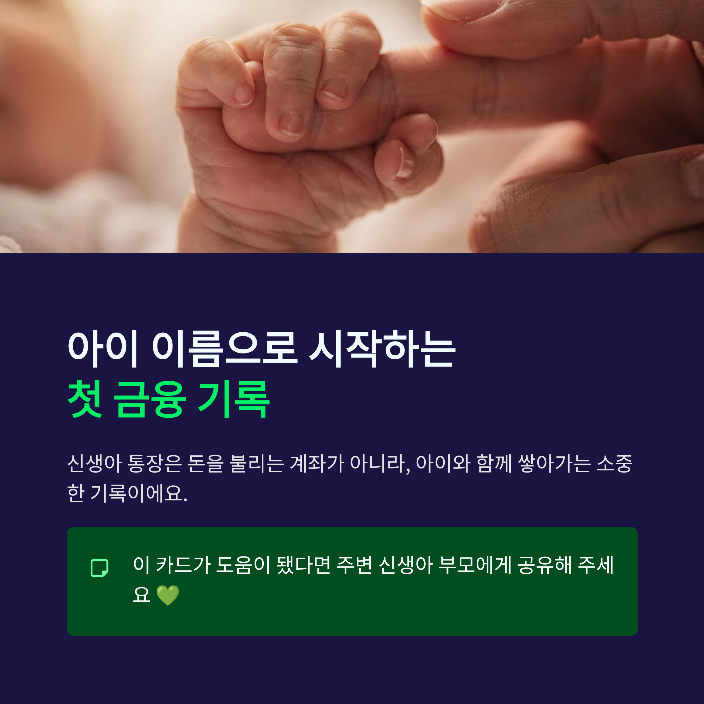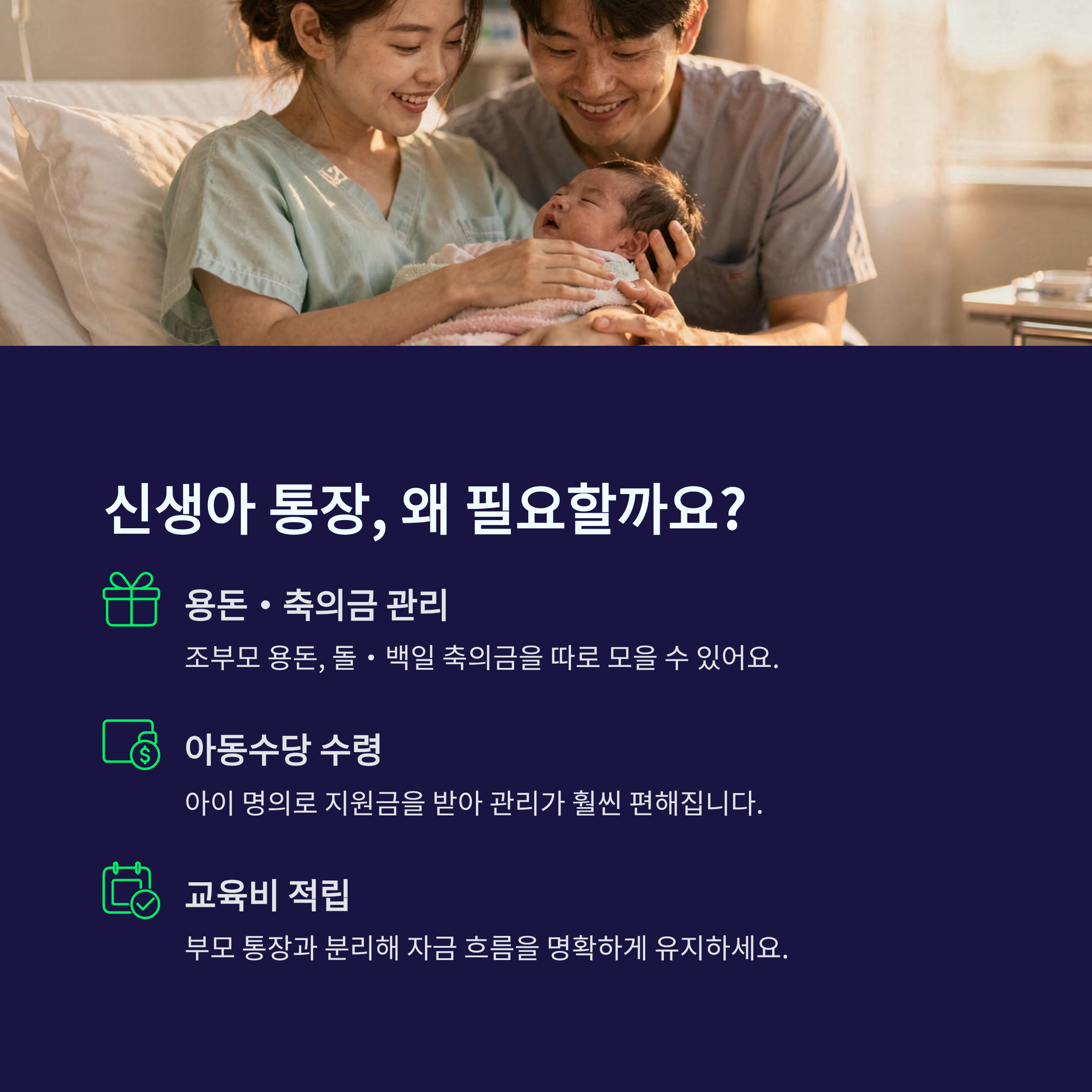 신생아 통장은 돈을 불리기 위한 계좌라기보다 아이 이름으로 시작하는 첫 금융 기록 같아요.