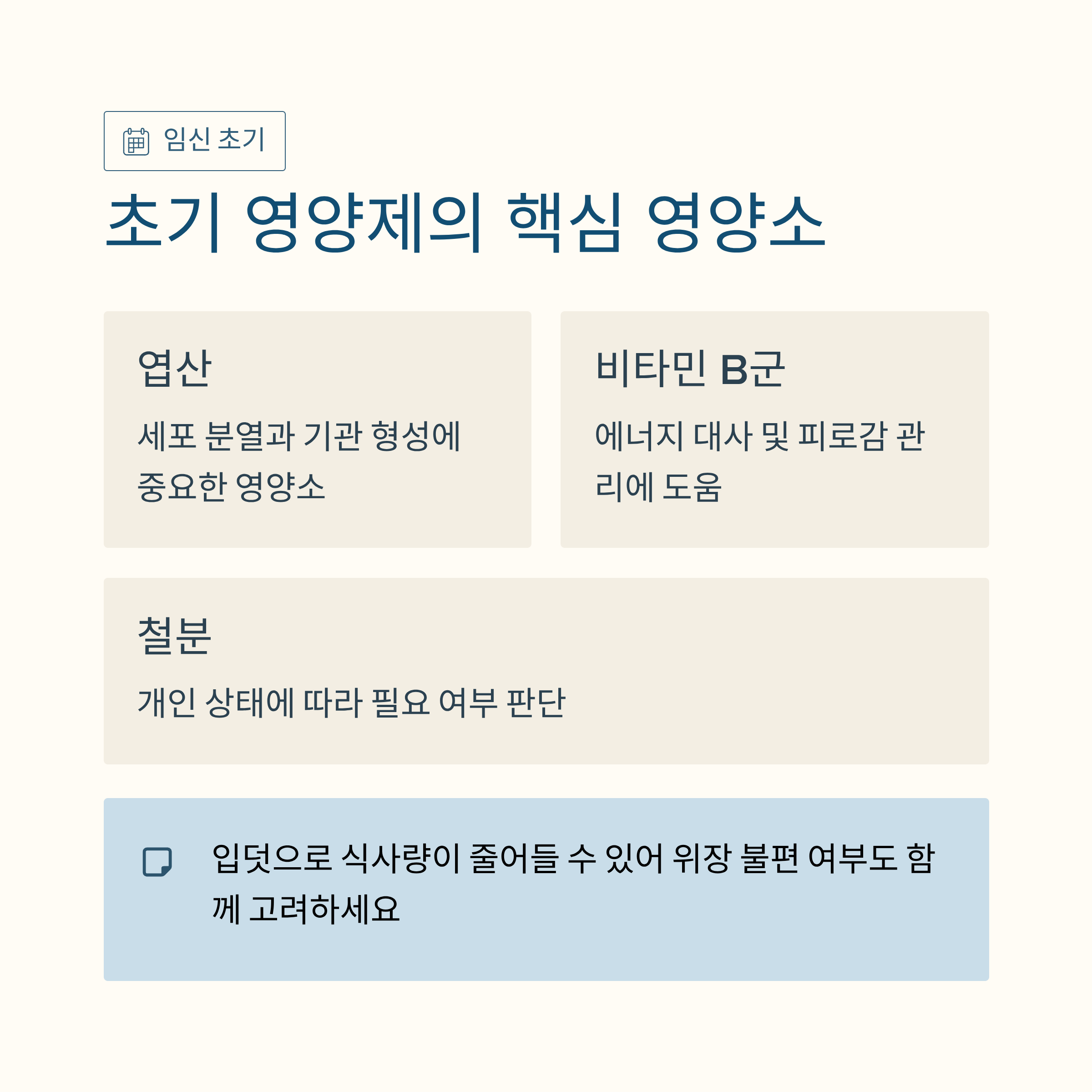 임신 초기에는 입덧 등으로 식사량이 줄어들 수 있어, 영양제 복용 시 위장 불편 여부도 함께 고려하셔야 합니다.