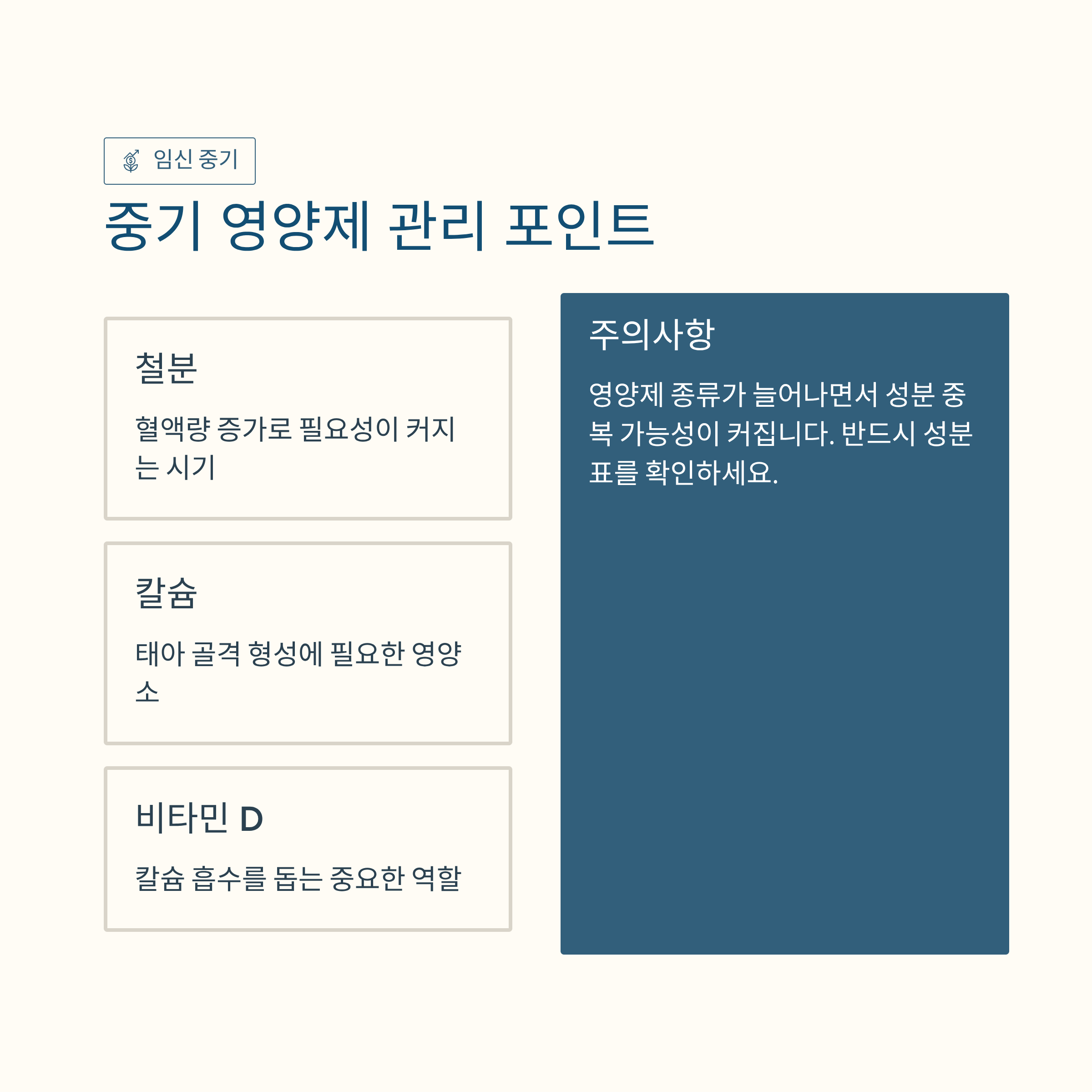 | 임신 중기 | 철분, 칼슘, 비타민 D 관리 필요성 증가 |