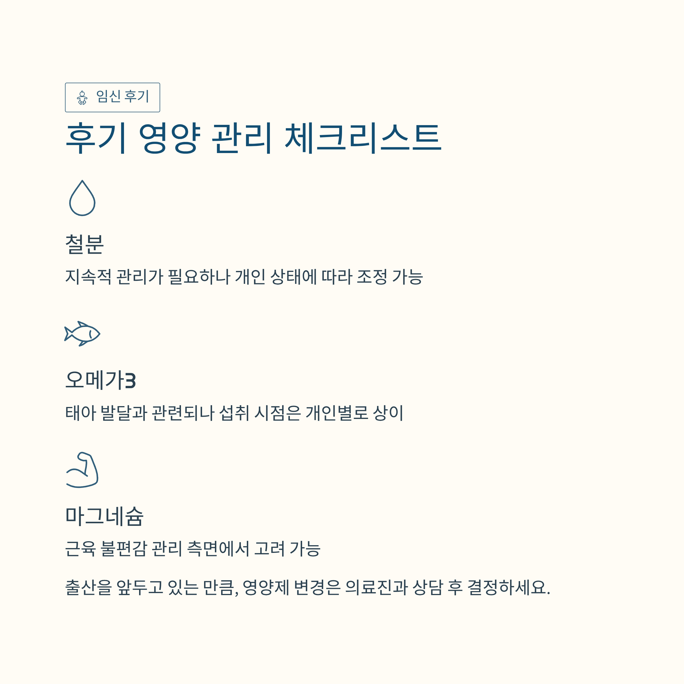 혈액량 증가와 관련해 필요성이 커질 수 있어, 중기 이후 관리 대상으로 자주 안내됩니다. -