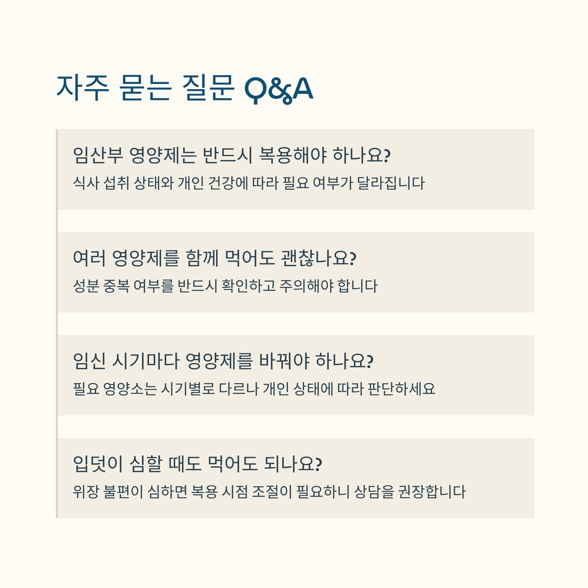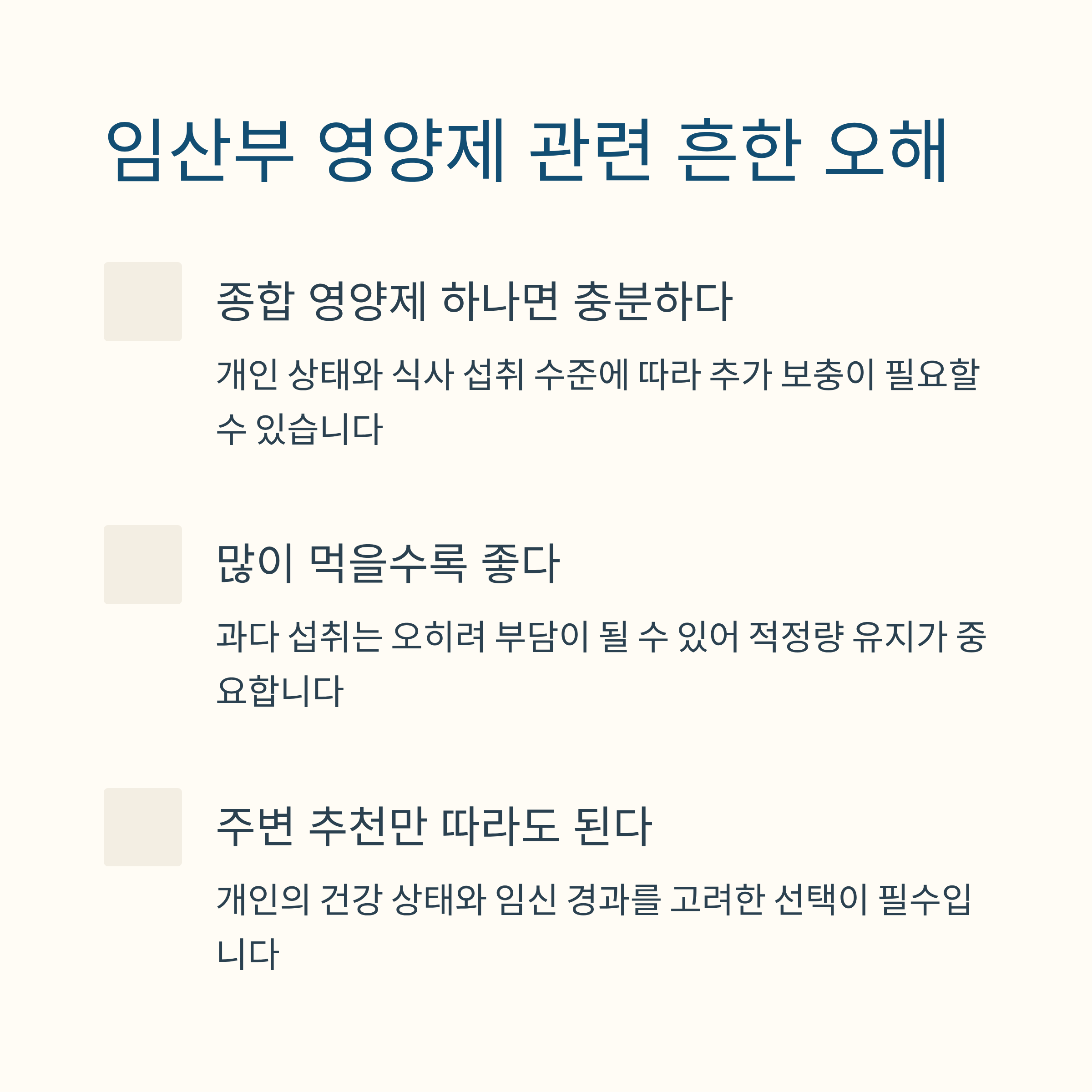 다만 모든 임산부에게 동일한 영양제가 반드시 필요한 것은 아니며, 식습관, 건강 상태, 임신 경과에 따라 필요 여부는 달라질 수 있습니다.
