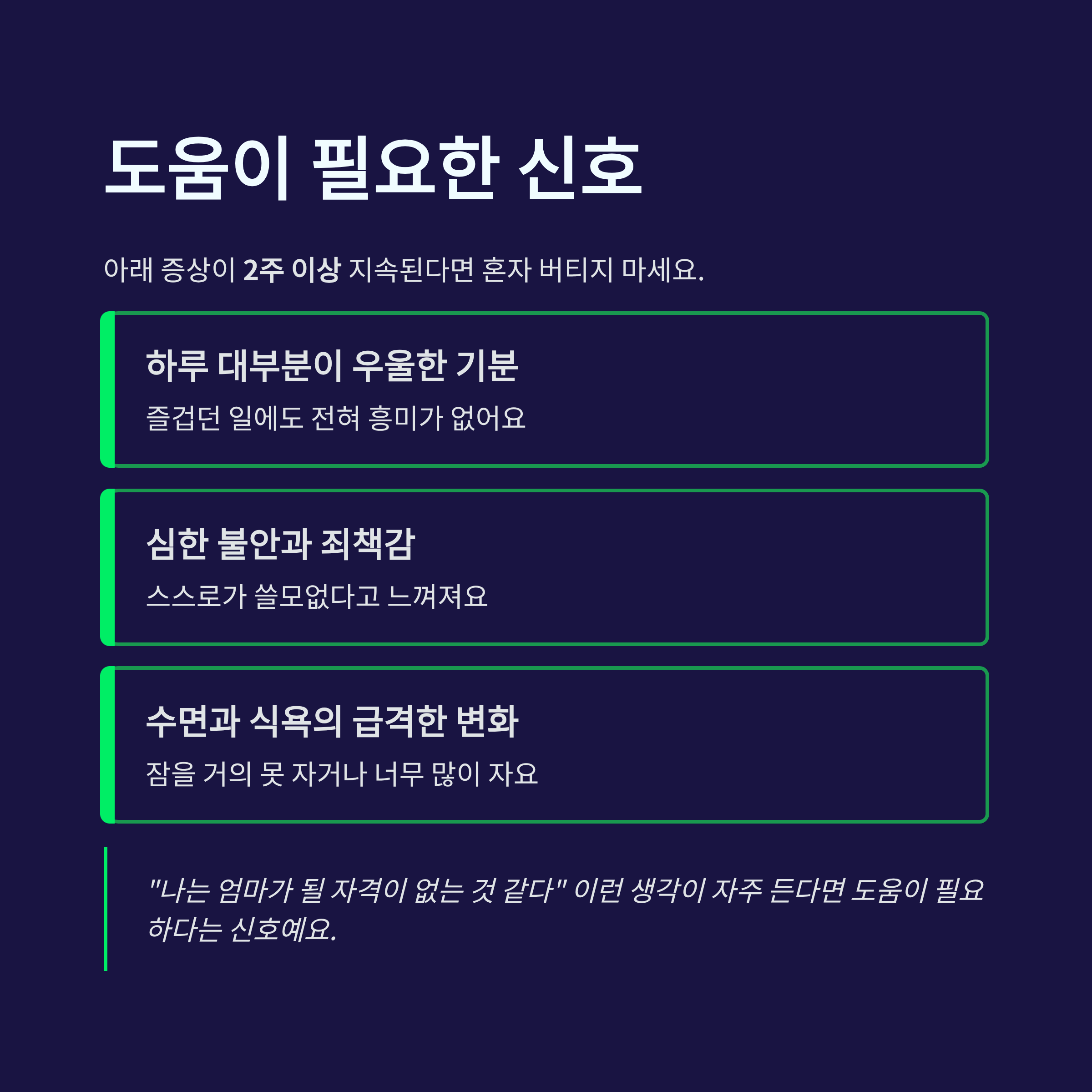 아래 증상이 2주 이상 지속된다면 혼자 버티지 않는 게 좋아요.