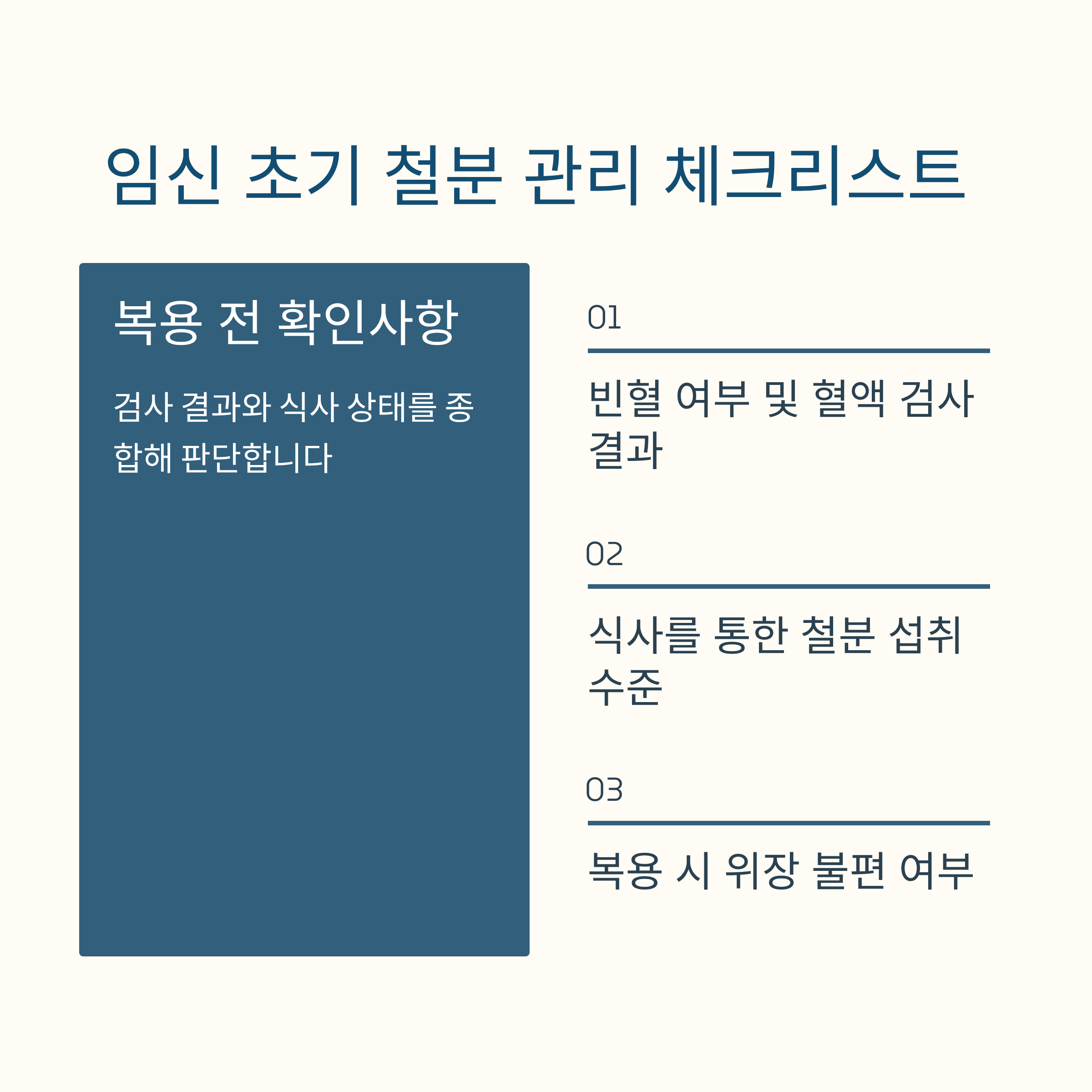 따라서 임신 초기 철분 복용은 일괄적으로 시작하기보다, 개인 상태에 따라 조정되는 경우가 많습니다.