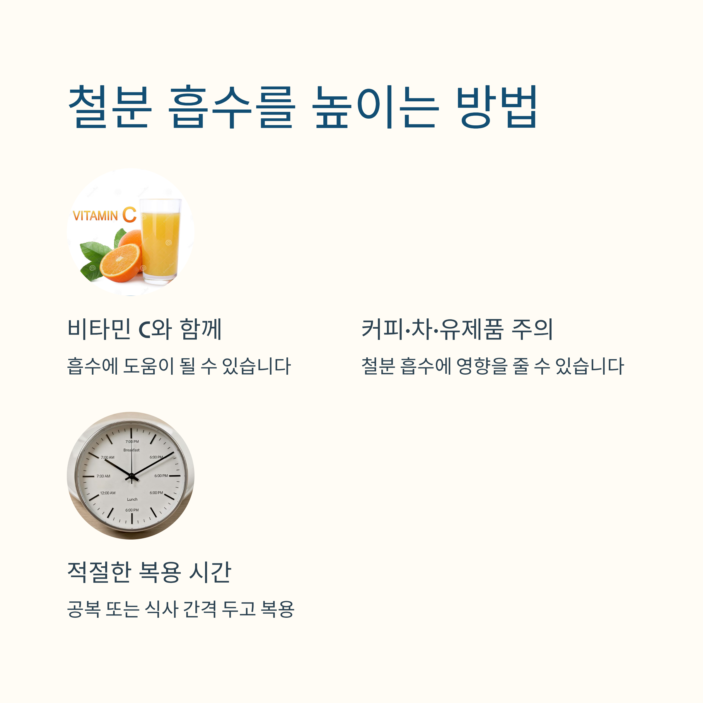 철분은 복용 시기와 함께 섭취하는 음식에 따라 흡수율이 달라질 수 있는 것으로 알려져 있습니다.